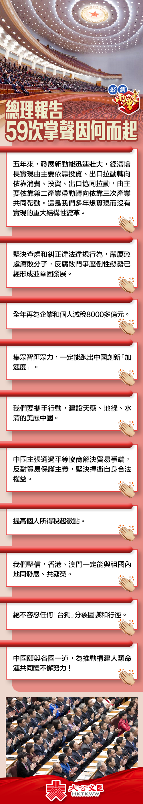 大公文匯全媒體報道:十三屆全國人大一次會議5日上午在北京開幕,國務院總理李克強作政府工作報告,全文近2萬字,既有對2017年國家經濟社會發展成就的盤點,也有對2018年工作的規劃和展望。處處亮點贏得了全場的點讚和掌聲。據統計,報告宣讀近兩個小時,現場響起了59次熱烈掌聲,其中多次掌聲還打斷了總理的講話。總理有哪些金句自帶掌聲,一張圖告訴你。