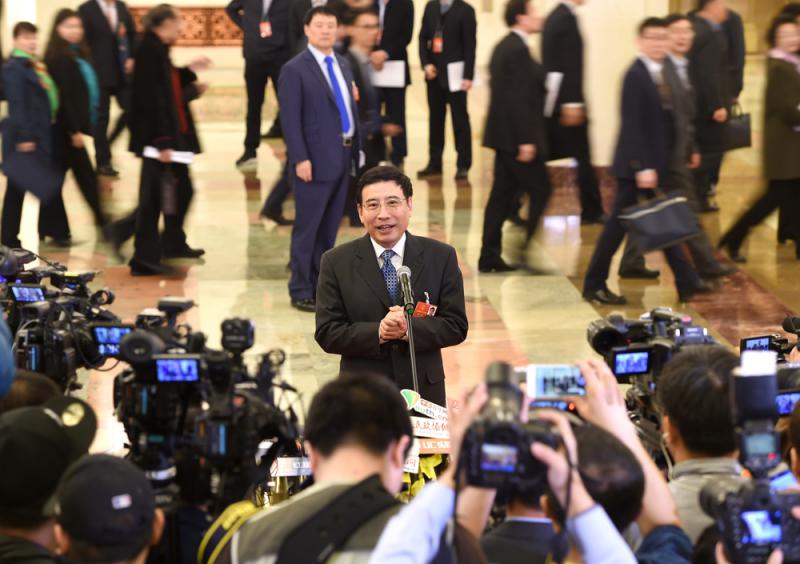 圖:中國工業和信息化部部長苗圩在「部長通道」上接受媒體採訪 /中新社