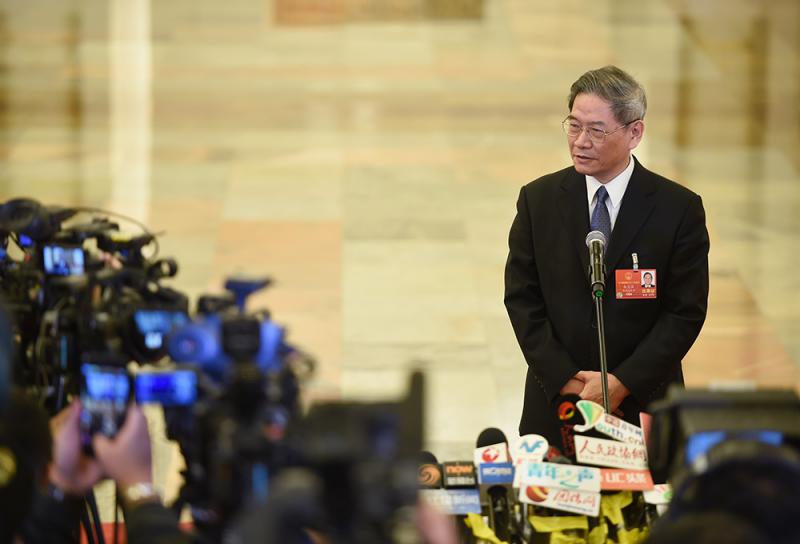 圖:國務院台辦主任張志軍5日在十三屆全國人大一次會議的「部長通道」上接受媒體採訪/中新社