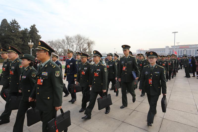 圖:十三屆全國人大一次會議5日上午在北京人民大會堂開幕。圖為解放軍和武警部隊代表步入會場 /大公報記者何嘉駿攝