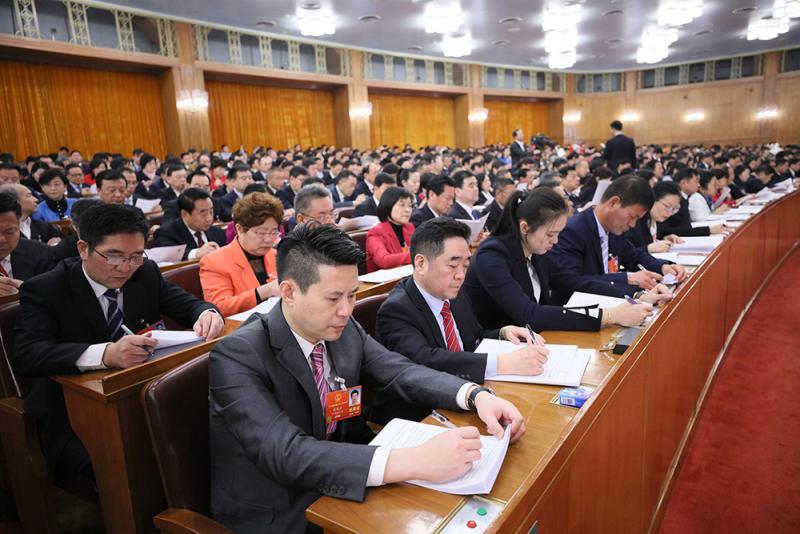 圖:3月5日,第十三屆全國人民代表大會第一次會議在北京人民大會堂開幕。這是代表們在認真聽政府工作報告/新華社