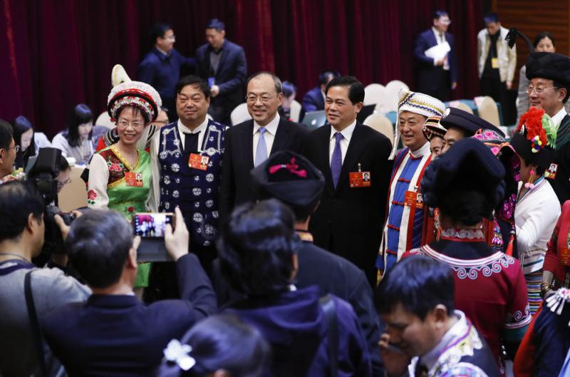 全國人大代表、雲南省委書記陳豪(左四)與全國人大代表、雲南省省長阮成發(左三)與參加會議的代表合影。中新社