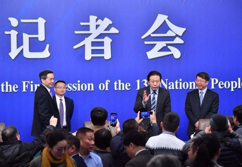 圖:7日,十三屆全國人大一次會議新聞中心舉行記者會,邀請財政部部長肖捷,副部長史耀斌、胡靜林就「財稅改革和財政工作」相關問題回答中外記者提問 新華社