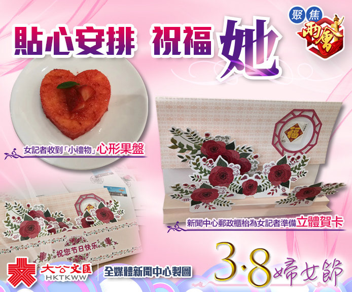 此外,兩會新聞中心內設有一個郵政櫃枱,供記者購買兩會紀念信封及紀念郵票。工作人員今天亦特地為購買紀念品的女記者準備了立體賀卡,祝女記者們節日快樂。有收到賀卡的女記者表示「很驚喜,很貼心」。