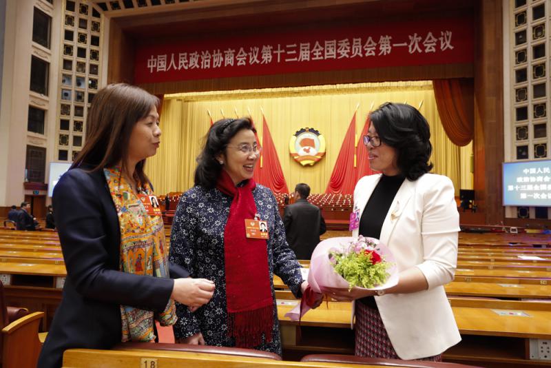 圖:王美華委員、馮丹龍委員與收到鮮花的王偉明委員(由左至右)在全國政協十三屆一次會議後討論交流 /中新社