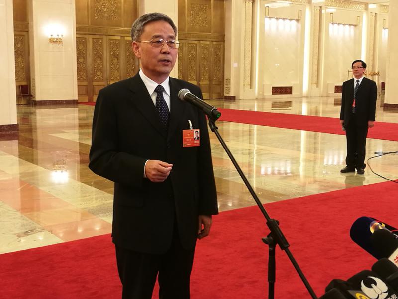 圖:銀監會主席郭樹清在「部長通道」回應傳媒提問/大公報記者張帥攝