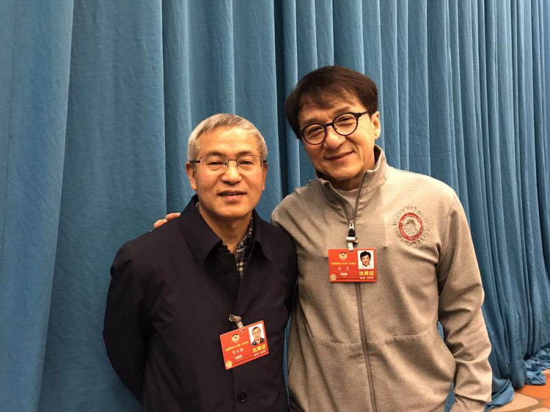 圖:全國政協委員成龍(右)帶頭簽署提案,並主動與提案起草人賀雲翱(左)合影 /大公報記者俞晝攝