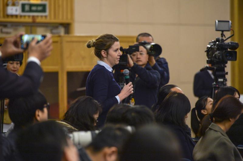 圖:路透社記者在記者會上提問/中新社
