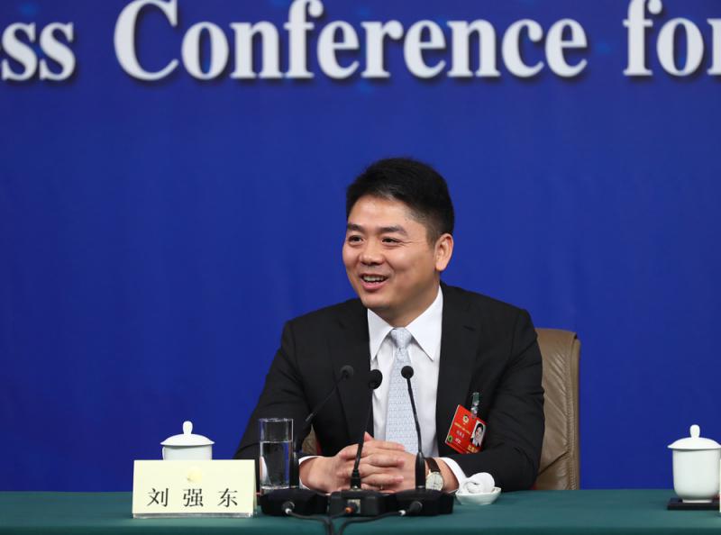 圖:全國政協委員,中國民間商會副會長,北京市工商聯副主席,京東集團董事局主席兼首席執行官劉強東回答記者提問/ 中新社