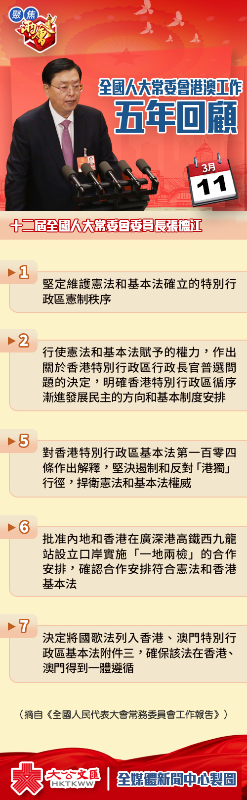 大公文匯全媒體報道:十三屆全國人大一次會議今日(11日)舉行第三次全體會議,十二屆全國人大常委會委員長張德江作全國人大常委會工作報告。過去五年,全國人大常委會堅定維護憲法和基本法確立的特別行政區憲制秩序。行使憲法和基本法賦予的權力,作出關於香港特別行政區行政長官普選問題的決定,明確香港特別行政區循序漸進發展民主的方向和基本制度安排。