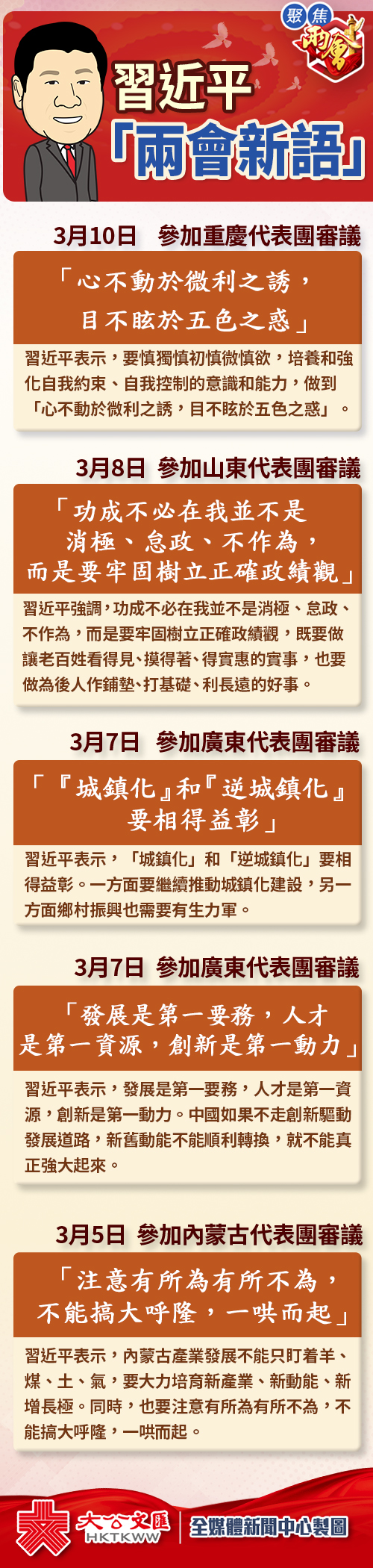 大公文匯全媒體報道:截至3月10日,中共中央總書記、國家主席、中央軍委主席習近平在2018年全國兩會期間,已經5次下團組與代表委員共商國是。梳理習近平的講話,治國理政新表述「金句」不斷,透露出中國下一步發展治理的重要方向。