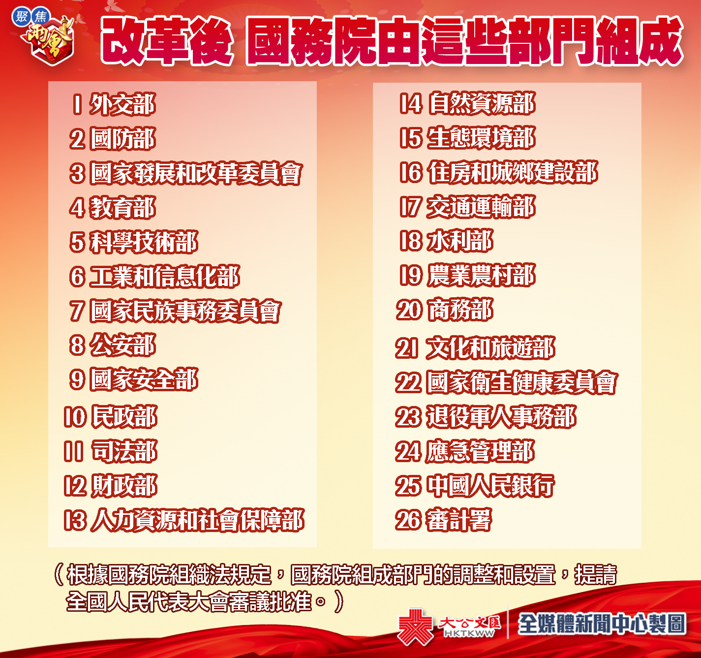 大公文匯全媒體報道:國務院機構改革方案今日(13日)提請十三屆全國人大一次會議審議。根據該方案,改革後,除國務院辦公廳外,國務院設置組成部門26個。