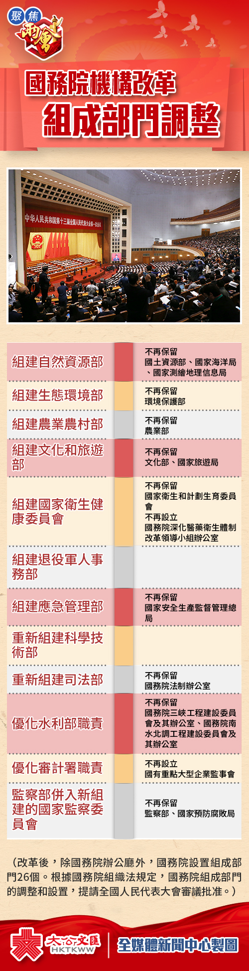 大公文匯全媒體報道:國務院機構改革方案今日(13日)提請十三屆全國人大一次會議審議。根據該方案,國務院正部級機構減少8個,副部級機構減少7個,除國務院辦公廳外,國務院設置組成部門26個。一圖帶你看懂國務院組成部門調整。