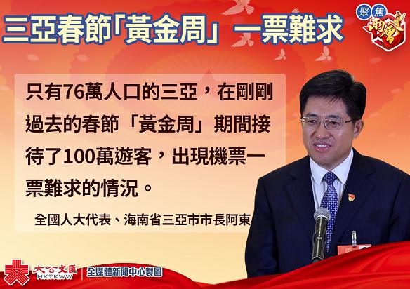 大公文匯全媒體報道: 十三屆全國人大一次會議第四場「代表通道」今日(13日)開啟。全國人大代表、海南省三亞市市長阿東回應了三亞春節期間旅遊業火熱的話題。他表示,「只有76萬人口的三亞,年度接待遊客超過2000萬人。在剛剛過去的春節『黃金周』,三亞接待了100萬人,機票一票難求。」