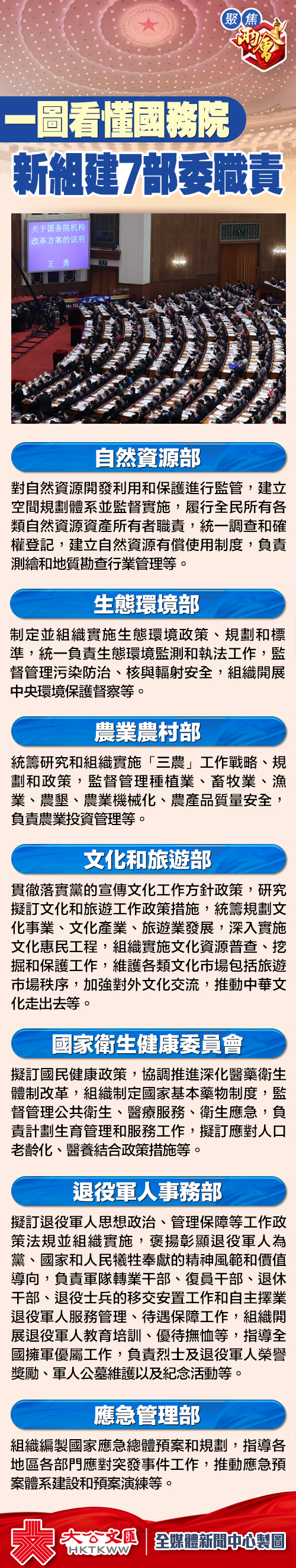 大公文匯全媒體報道:國務院13日提請十三屆全國人大一次會議審議機構改革方案議案。按照方案,組建自然資源部、生態環境部、農業農村部、退役軍人事務部、應急管理部等7部委。這是中國改革開放以來的第8次大規模機構改革。改革後,除國務院辦公廳外,國務院設置組成部委26個。