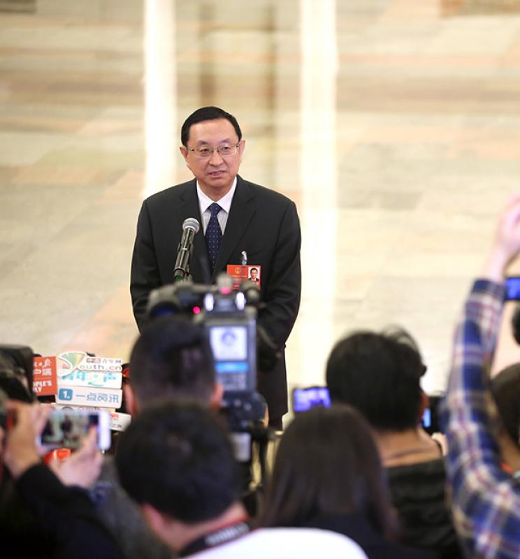 圖:13日,文化部部長雒樹剛在「部長通道」接受採訪/新華社