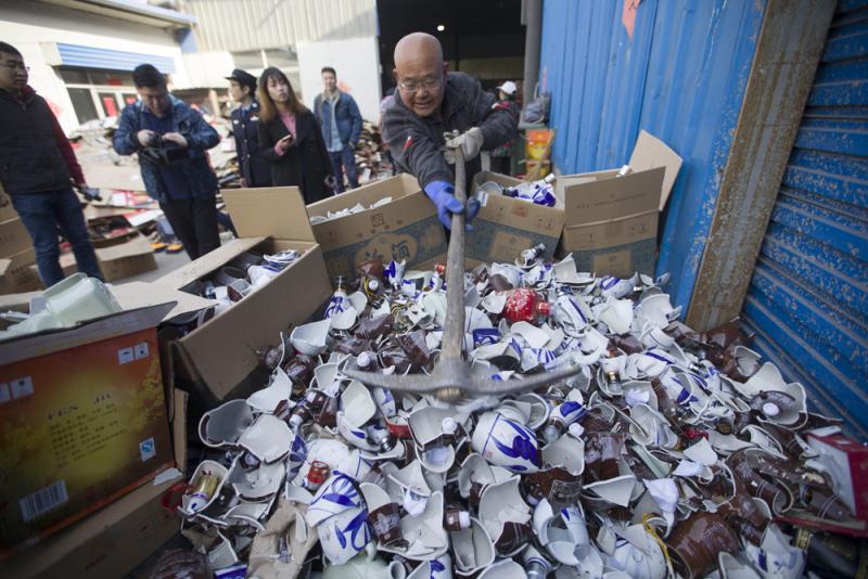 圖:13日,隨着「3.15」國際消費者權益日臨近,山西太原警方對法院已審結案件中所涉及的假酒進行集中銷毀/中新社