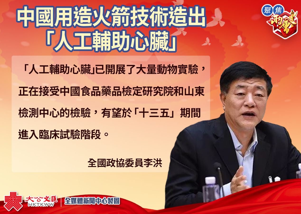 李洪透露,「人工輔助心臟」已開展了大量動物實驗,正在接受有關檢驗,有望於「十三五」期間進入臨床試驗階段。