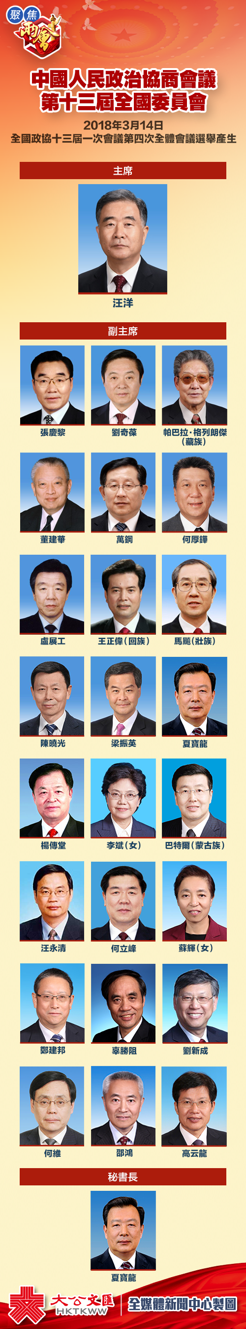 大公文匯全媒體綜合報道:全國政協十三屆一次會議第四次全體會議今日(14日)下午在北京人民大會堂舉行。會議選舉了中國人民政治協商會議第十三屆全國委員會主席、副主席、秘書長和常務委員。中共中央政治局常委汪洋當選政協第十三屆全國委員會主席。