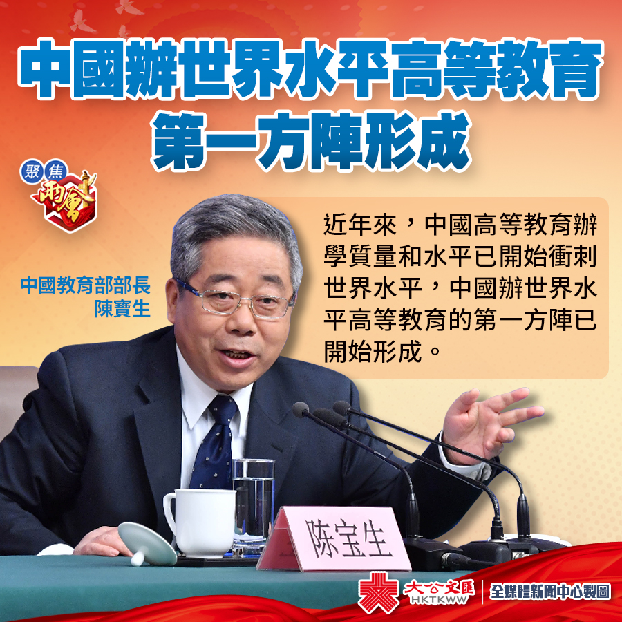 大公文匯全媒體報道:中國教育部部長陳寶生16日在十三屆全國人大一次會議記者會上表示,中國辦世界水平高等教育的第一方陣已開始形成。