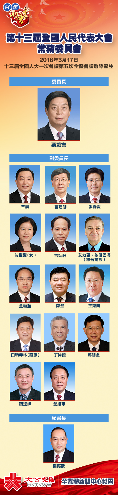 大公文匯全媒體報道:十三屆全國人大一次會議第五次全體會議17日上午在北京人民大會堂舉行。中共中央政治局常委栗戰書當選為全國人大常委會委員長。會議同時選出全國人大常委會副委員長及秘書長。
