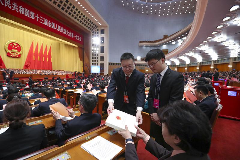 圖:十三屆全國人大一次會議17日舉行第五次全體會議,選舉產生新一屆國家領導人。圖為工作人員發放選票/中新社