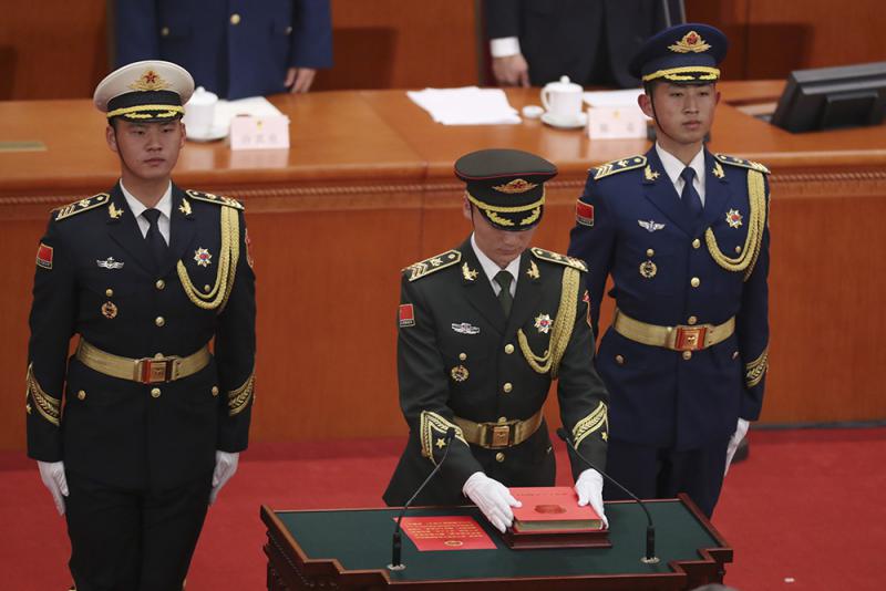 圖:憲法宣誓儀式上禮兵護送《中華人民共和國憲法》入場/中新社