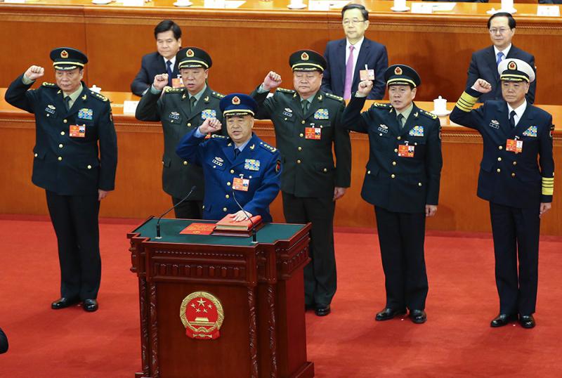 圖:18日,十三屆全國人大一次會議在北京人民大會堂舉行第六次全體會議。圖為中央軍委副主席、委員進行憲法宣誓/中新社
