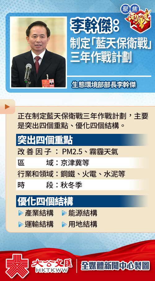 大公文匯全媒體報道:新組建的生態環境部部長李幹傑19日在人民大會堂「部長通道」上表示,正在制定藍天保衛戰三年作戰計劃,主要是突出四個重點、優化四個結構。