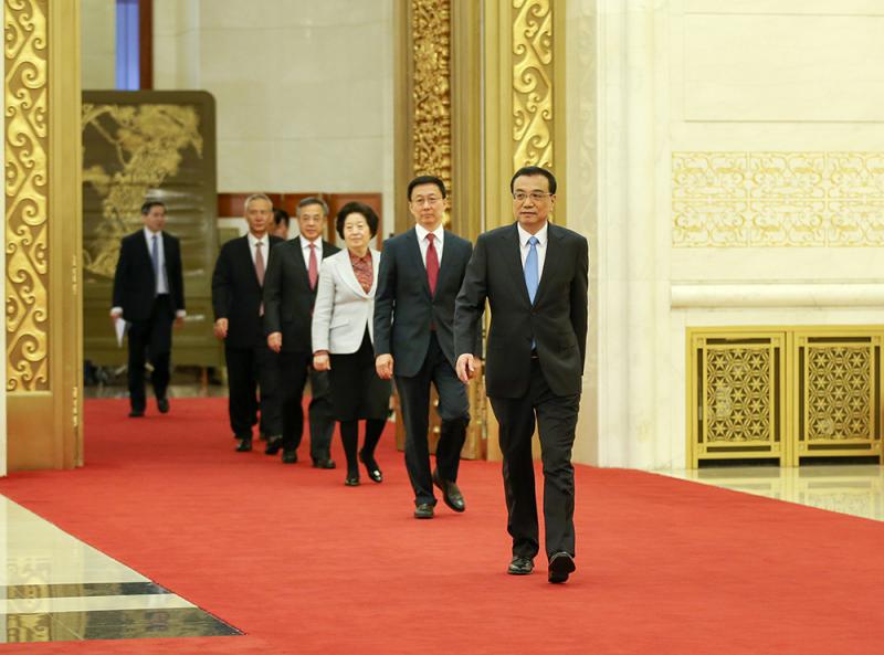 圖:20日,國務院總理李克強和副總理韓正、孫春蘭、胡春華、劉鶴在北京人民大會堂與中外記者見面 中新社