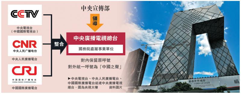 根據21日公布的《深化黨和國家機構改革方案》,中國將整合中央電視台(中國國際電視台)、中央人民廣播電台、中國國際廣播電台,組建新的中央廣播電視總台。前三者建制撤銷,對內保留原呼號,對外統一為「中國之聲」。其主要職責是加強和改進輿論監督、加強國際傳播能力,講好中國故事等。原中央電視台台長慎海雄任新組建的中央廣播電視總台台長、黨組書記。有學者指出,媒體融合的關鍵在於構建全新的用戶平台,重建媒體與用戶之間的信任與連接。/大公報記者周琳北京報道