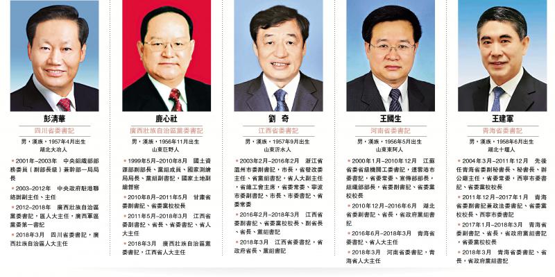 此外,根據新華社公布的個人資料顯示,調任廣西壯族自治區黨委書記的鹿心社曾任國土資源部耕地保護司司長,1999年5月後任國土資源部副部長,甘肅省委副書記,2011年6月任江西省委副書記、代省長,2012年2月任省長,2016年6月任省委書記。由江西省長升任為黨委書記的劉奇,曾任浙江省巨化集團董事長、溫州市長、省發改委主任,2008年1月後任省人大副主任,寧波市長,省委常委、寧波市委書記,2016年2月任江西省委副書記,同年9月任省長。