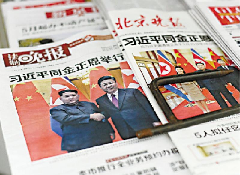 圖:內地報刊28日紛紛在頭版報道金正恩訪華的重大消息 法新社