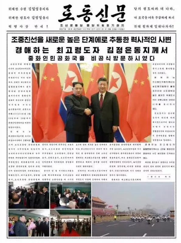 據了解,平日裏每天6個版的《勞動新聞》增加到8個版,前7個版都是有關金正恩訪華的消息和照片,頭版的標題是:「推動朝中友誼進入新的更高階段的歷史性事件─敬愛的最高領導人金正恩對中華人民共和國進行非正式訪問。」