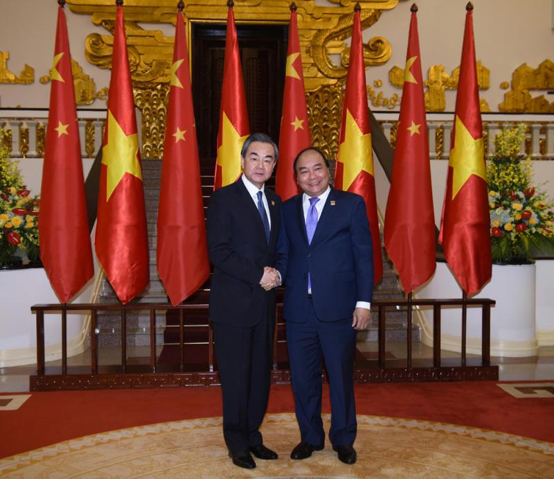 圖:3月31日,越南總理阮春福(右)在河內會見中國外交部長王毅\新華社