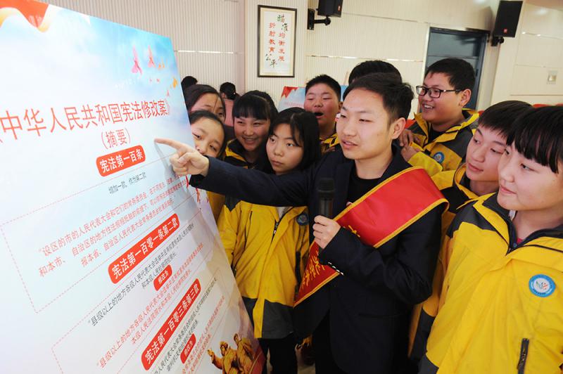 圖:3月19日,安徽合肥志願者律師在給學生們講解憲法修正案調整內容\中新社