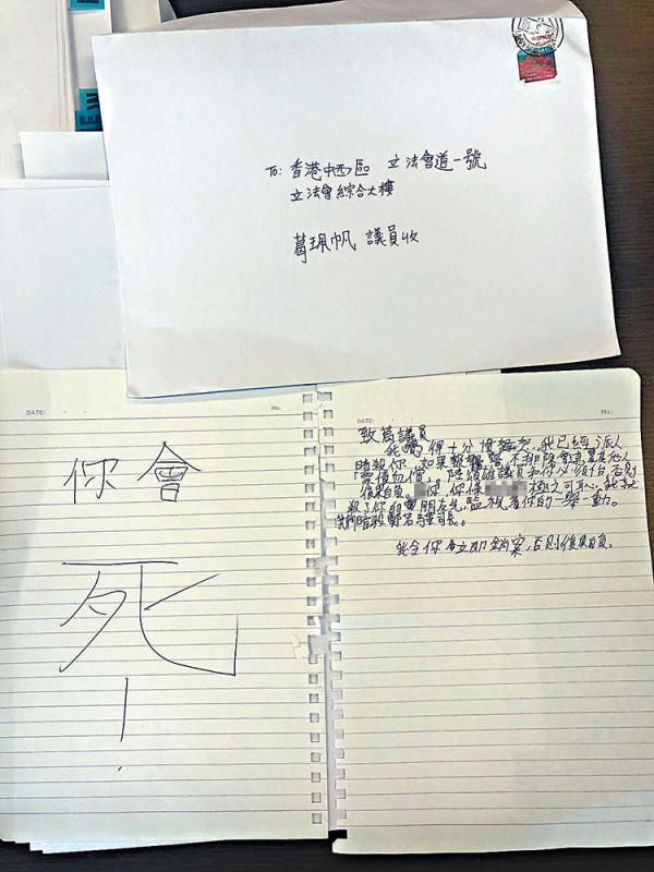 圖:繼上周的日文恐嚇信事件之後,昨日再有死亡恐嚇信寄到立法會議員葛珮帆的辦事處。該信從香港寄出,其中一頁用歪扭筆跡寫着「你會死!」