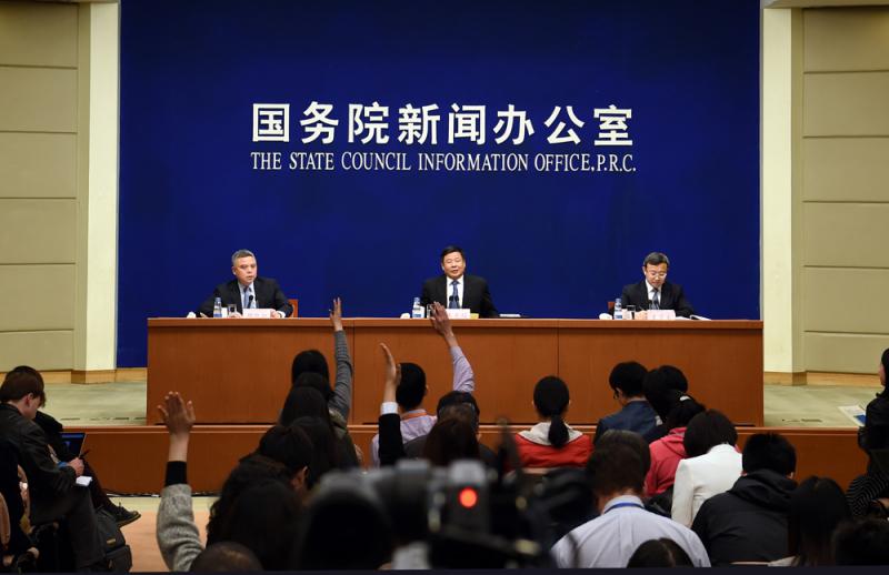 圖:4日,國務院新聞辦公室在北京舉行吹風會,財政部副部長朱光耀、商務部副部長王受文介紹中美貿易有關情況\中新社