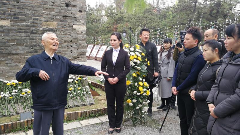 現場,97歲的莊炎林站在千瘡百孔的彈孔牆前,向學生和遊客們講起了抗戰故事:「台兒莊是中華民族揚威不屈之地。戰爭的慘烈是你們難以想像的,戰後的台兒莊一片瓦礫,一間完整的屋子都沒有。」