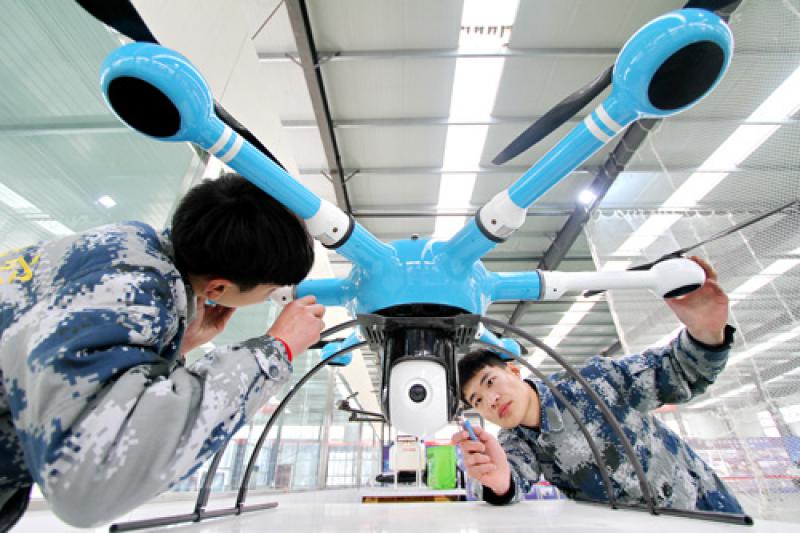圖:河北一家科技公司技術人員在調試多旋翼無人機\資料圖片