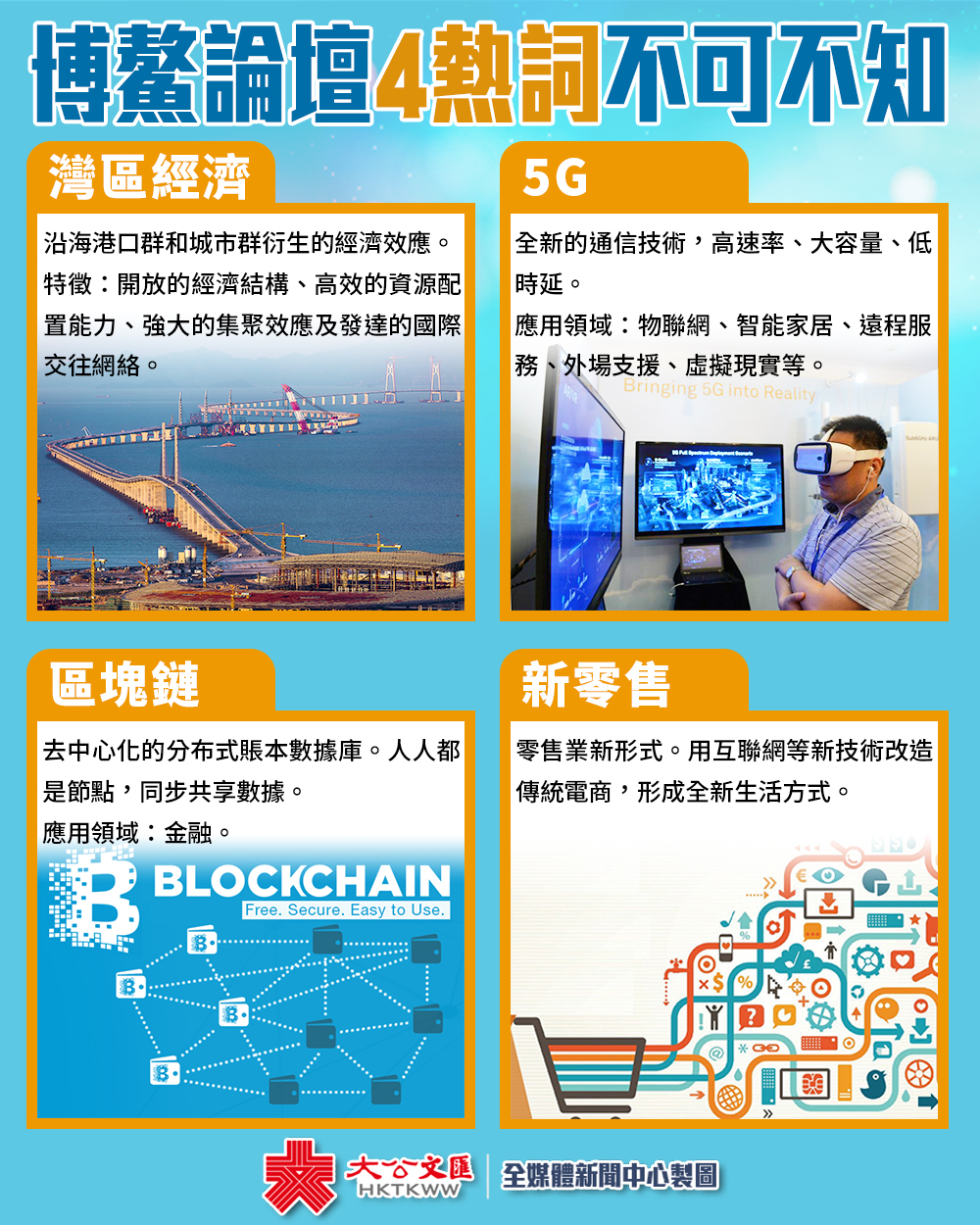 大公文匯全媒體綜合報道:博鰲亞洲論壇2018年年會已在海南博鰲拉開序幕。來自世界各地的領導人、商界人士以及專家學者等匯聚一堂,把握經濟動向,暢談世界發展。灣區經濟、5G、區塊鏈、新零售等一大批新詞成為了論壇參與者熱議的焦點。學習這4個熱詞,帶你了解博鰲論壇,洞悉發展潮流。