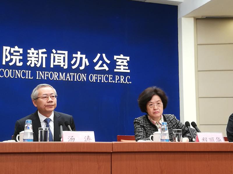 圖:人社部副部長湯濤(左)、日前新履職的財政部副部長程麗華在發布會上\大公報記者張帥攝