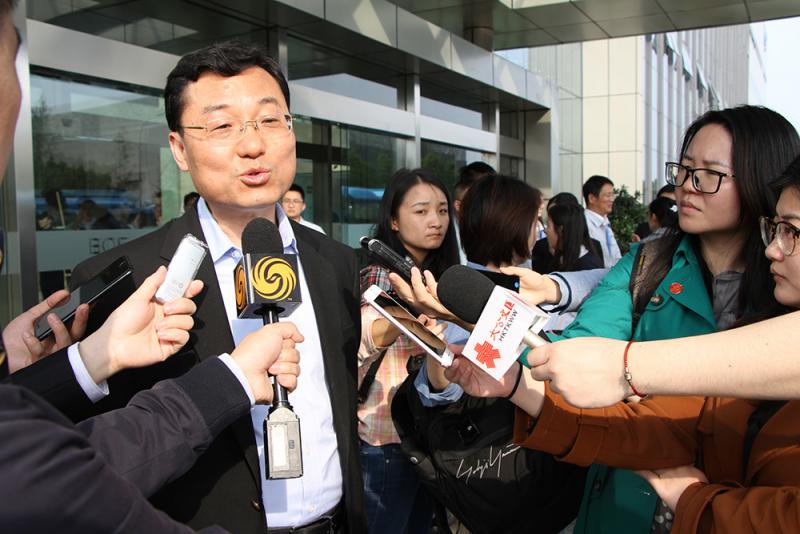 圖:外交公署特派員謝鋒在京東方高科技企業門前接受採訪/大公報記者李兵攝