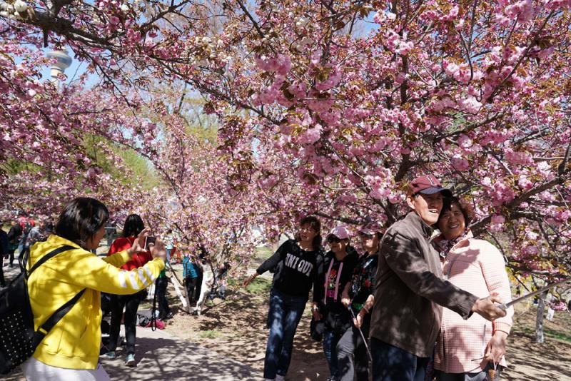 4月11日,遊客在北京玉淵潭公園晚櫻林中賞櫻、拍照。時下,隨着北京玉淵潭公園的早櫻花落謝幕,園內的近千株晚櫻相繼綻放,進入最佳觀賞期。