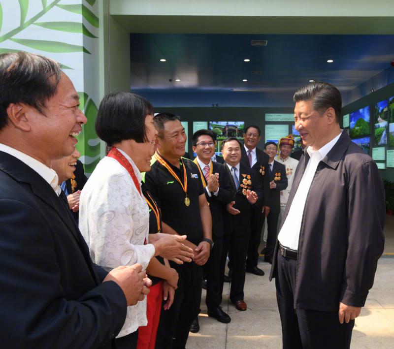 圖:13日上午,習近平在海南省博物館門前廣場上同海南省勞動模範和行業代表交談/新華社