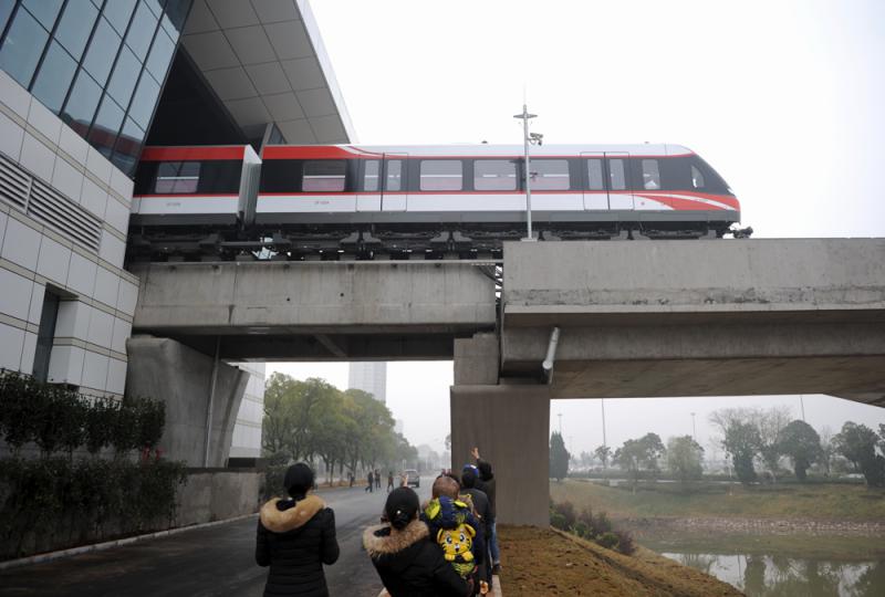 圖:2015年,中國首條中低速磁浮交通試運,市民圍觀磁懸浮列車 資料圖片