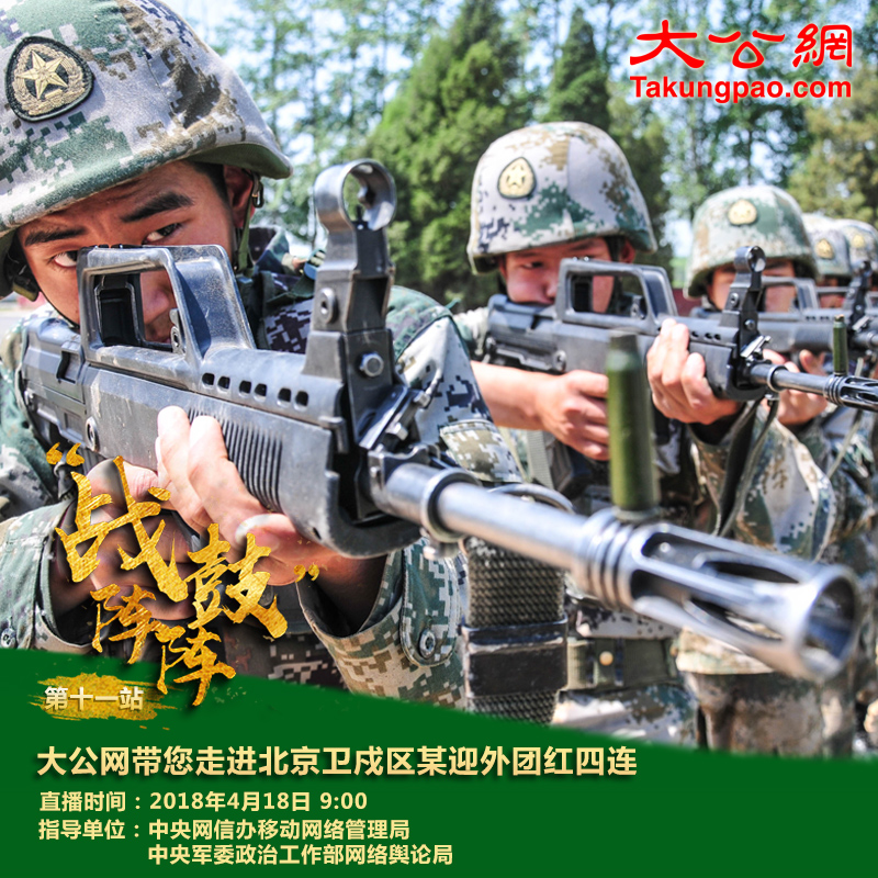 4月18日9時中央軍委政治工作部網絡輿論局組織的「戰鼓陣陣系列網絡直播第十一站,探訪北京衛戍區某迎外團紅四連,與您近距離感受完美的中國迎外「明信片」的大氣魅力。