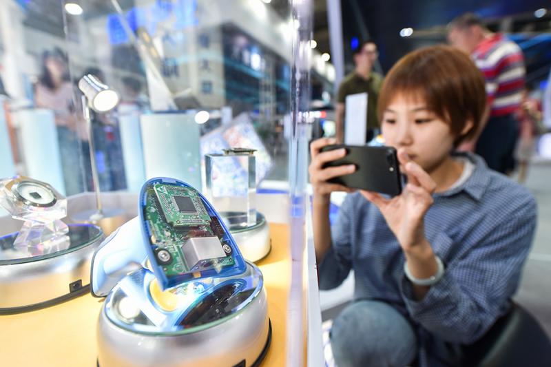 圖:4月23日的首屆數字中國建設成果展覽會上,觀眾拍攝數字公民安全解碼芯片 新華社
