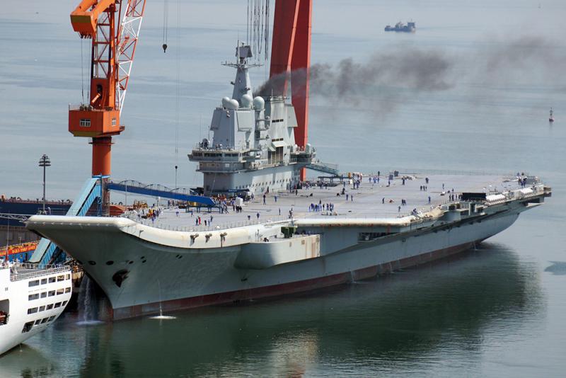 25日,首艘國產航母下水即將滿一周年。當日航母與綜合保障船相繼啟動主機測試,煙囱冒出大量濃煙。已完全清空的航母甲板上,大批工人正重新漆刷跑道線。近日來,航母始終在原泊位停靠,暫未有要入塢和出海的跡象。 (記者 宋偉)