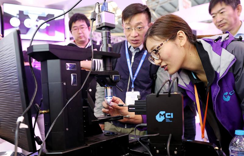 圖:4月19日,參觀者在第六屆中國(上海)國際技術進出口交易會上欣賞一款超精密無線顯微鏡 新華社